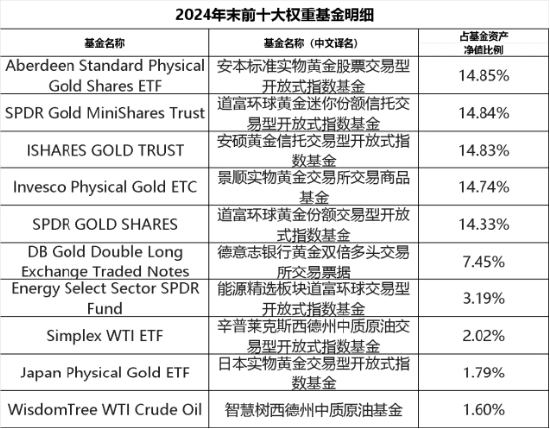 2024年末,全球商品前十大权重基金中,黄金主题ETF占基金资产净值比例达82.83%,原油等能源主题ETF占基金资产净值比例为6.81%。