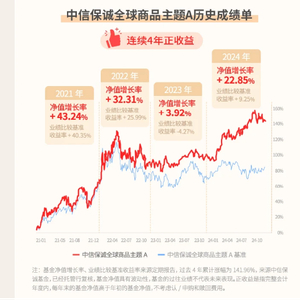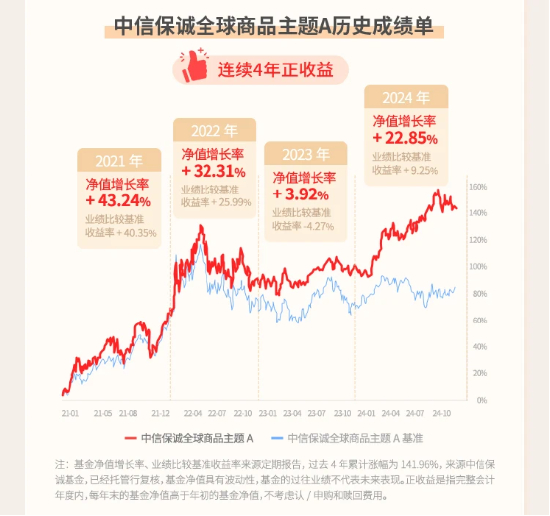 根据季报披露,信保诚全球商品主题A(165513)已经连续四年获得正收益,累计涨幅超过141%,各年度收益如下: