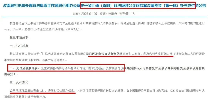 1月3日发布第一次退赔集资参与人公告,本次可分配资金3857971.75元,退赔比例为6.591%,转账的的方式发放至此前登记的银行账户内。