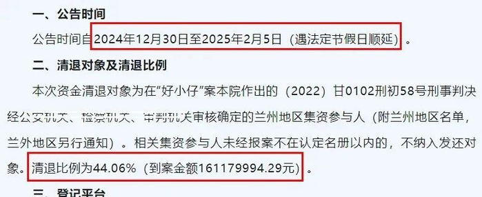 到2025年2月5日都还在公告期内,“好小仔”案预计本次的退赔比例44.06%,在受损者在名单内的,还需要在线上的“好小仔退款人员信息采集”平台上进行登记。