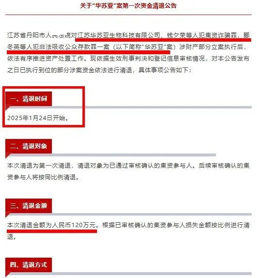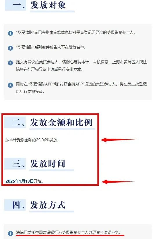 核对登记环节过后,“华夏信财”案安排在2025年1月13日起,按照已确定的29.96%的退赔比例发放。