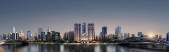 百年前的苏州河,工厂林立,商贾云集,百业兴盛,水岸的繁华景象不输于宋代“清明上河图”盛况。因水兴市,筑巢引凤。如今的苏州河又被赋予了历史新使命。自2020年上海苏州河中心城区岸线基本贯通,“一江一河”公共空间品质提升民心工程落地后,苏州河两岸的空间格局正在更新迭代,滨水天际线向上发展。此刻,在距离上海人民广场仅1公里的城市核心,苏州河畔新桥路桥侧,一栋高层和三栋超高层住宅楼拔地而起,在河心投下了长长的倒影。这里将诞生足以引领豪宅标准的典范——海玥黄浦源。