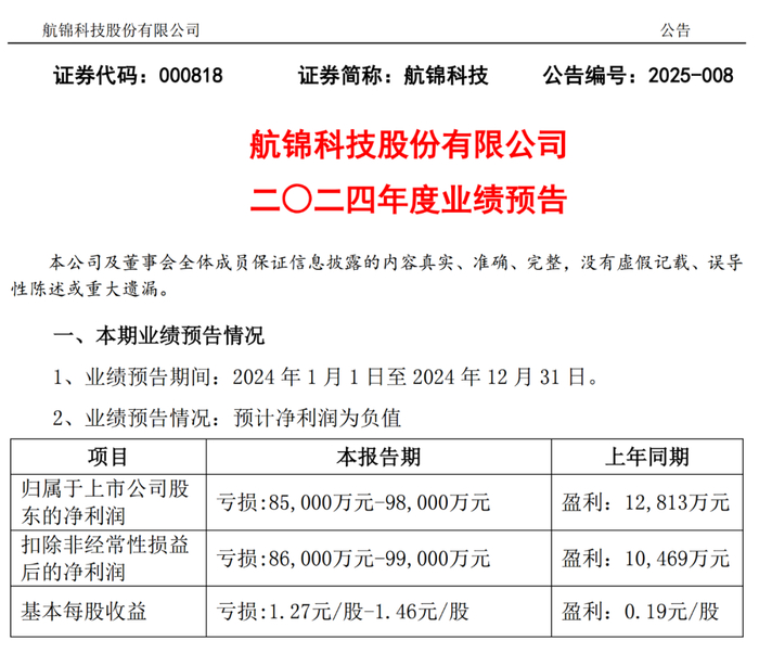 根据航锦科技披露的业绩预告,公司预计2024年全年亏损8.5亿元-9.8亿元。