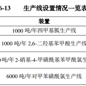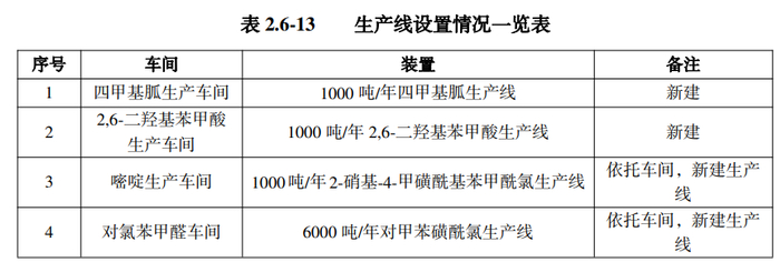建设内容:本项目新建2,6-二羟基苯甲酸生产车间,设置1000t/a2,6-二羟基苯甲酸生产线;新建四甲基胍生产车间,设置1000吨/年四甲基胍生产线;在现有嘧啶车间内设置1000吨/年 2-硝基-4-甲磺酰基苯甲酰氯生产线,在现有对氯苯甲醛车间内设置6000吨/年对甲苯磺酰氯生产线,通过现场踏勘,建设单位已建成嘧啶、对氯苯甲醛车间并安装完车间设备及废气处理设施等。