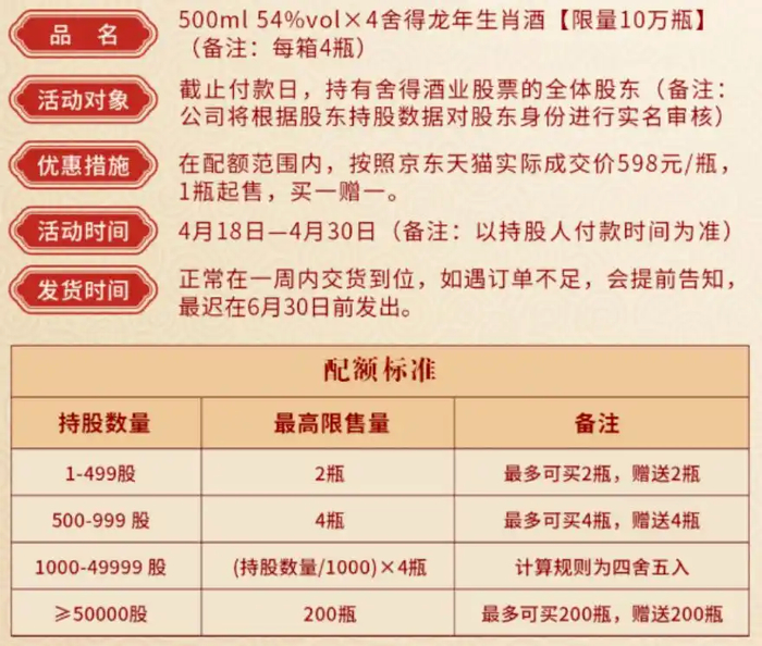 2024年4月17日,舍得酒业发布的股东回馈方案:舍得酒业将提供500ml54%volx4舍得龙年生肖酒,限量10万瓶,在配额范围内按照京东天猫实际成交价598元/瓶,1瓶起售,买一赠一。