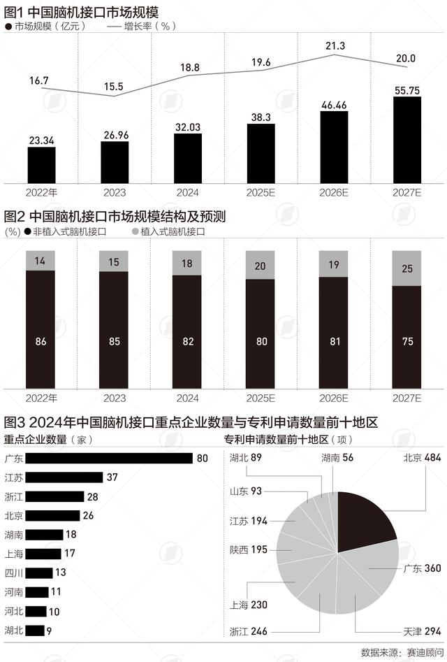 赛迪顾问近日公布的《中国脑机接口产业发展现状及趋势》(下称“报告”)显示,2024年,中国脑机接口市场规模为32亿元,增长率为18.8%。随着脑机接口技术创新成果不断涌现,医疗应用场景不断深化,消费、工业、教育等应用场景不断拓展,市场需求将持续提升,预计到2027年中国脑机接口市场规模将达到55.8亿元,增长率为20%。
