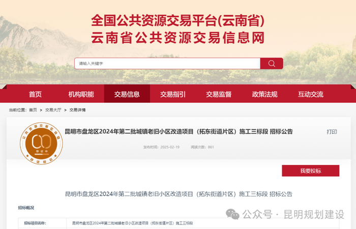 2月19日,云南省公共资源交易信息网上发布了“昆明市盘龙区2024年第二批城镇老旧小区改造项目(拓东街道片区)施工三标段、四标段招标公告”,公告主要围绕拓东街道老旧小区的基础设施配套工程及配套提升工程等进行。