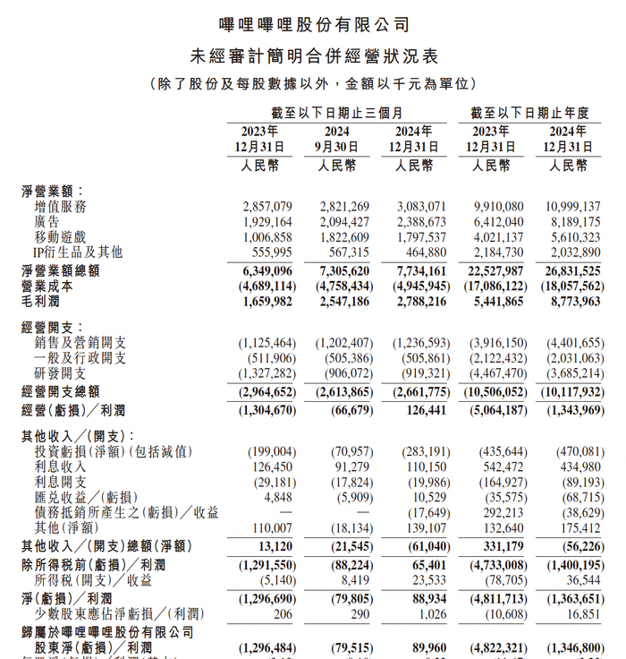 B站2024年收入268.3亿元,广告、游戏推动Q4全面盈利