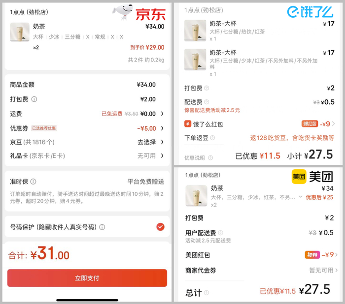 知危在同一时间分别在美团、饿了么、京东对比了同一家店的价格,京东要比另外两家贵 3 块钱,并且京东的起送门槛是 20 元,美团为 13 元,饿了么为 15 元。