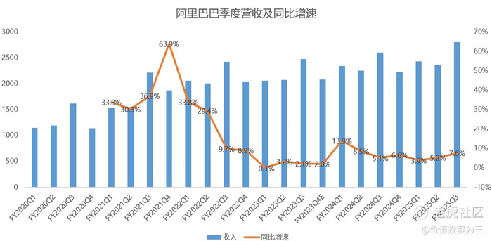 先来看收入,阿里巴巴25财年三季度营收2801.5亿人民币,同比增长7.6%,超过分析师预期的2773.7亿,增速创一年来新高: