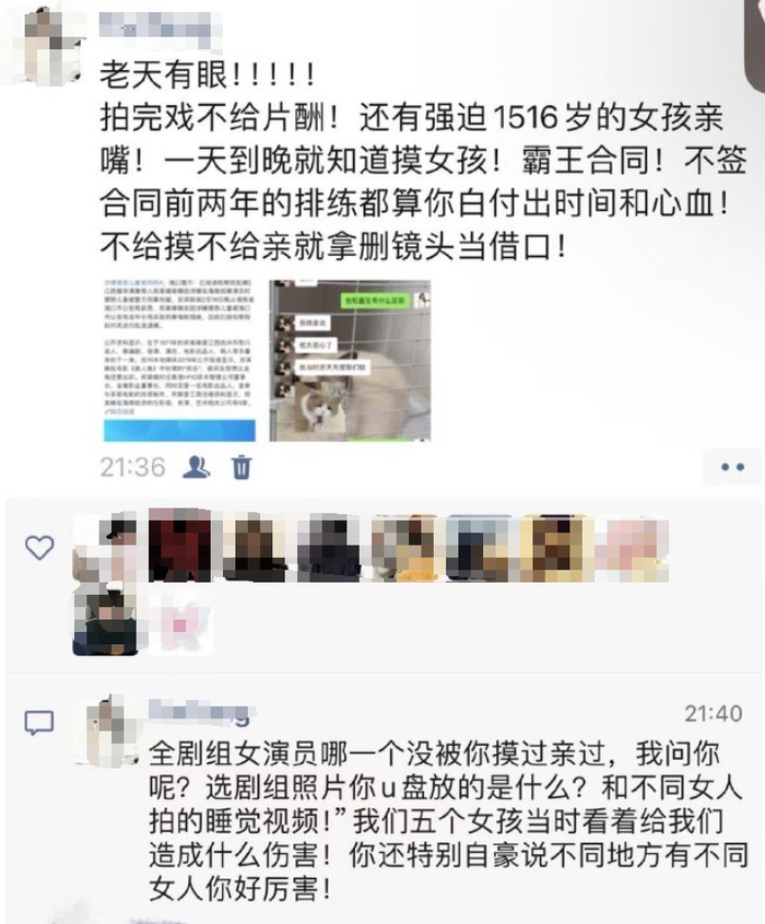 一位报料人提到:全剧组女演员哪个没被你摸过亲过,还有强迫15、16岁女孩亲嘴。