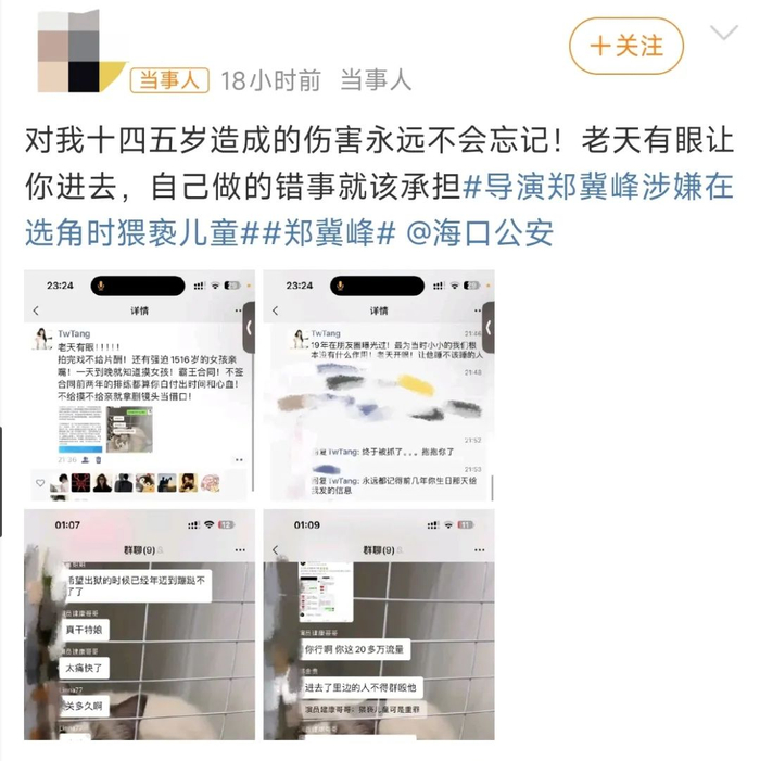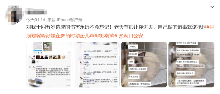还有人发文称郑某某对在自己十四五岁时造成伤害,永远都不会忘记。