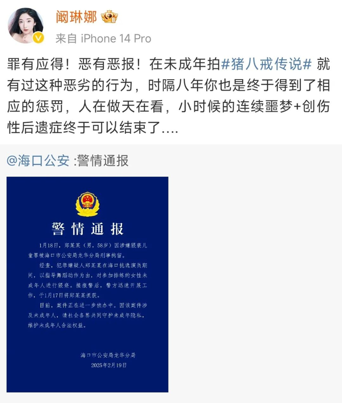 阚琳娜还表示,称看到郑某某因涉嫌猥亵儿童被刑拘的消息后,整个人都懵了,过往的种种在脑子里回放,眼泪也吧嗒吧嗒往下掉。整整八年过去了,他还是死性不改,最终还是因为这种事情进去了,真的是咎由自取,罪有应得!