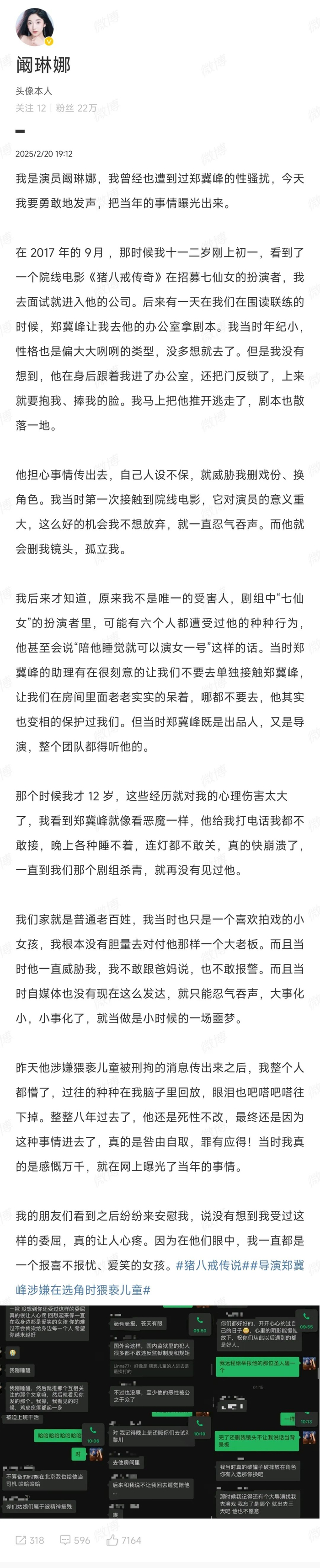 阚琳娜表示,2017年的9月,自己刚上初一,去参加郑某某公司面试角色的时候被性骚扰,当时只有12岁。后来才知道,原来自己不是唯一的受害人,剧组中“七仙女”的扮演者里,可能有六个人都遭受过他的种种行为。