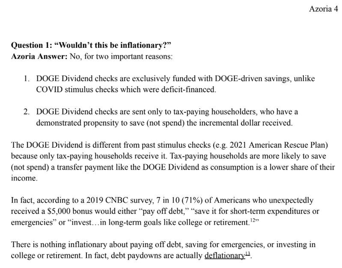 而Fishback在他的方案文件中分析认为,DOGE分红支票不会刺激通胀,理由有二,一是,分红支票的资金全部来自DOGE的节余,和新冠疫情期间政府通过增加财政赤字产生的刺激性支出支票不同;二是,分红支票只发给纳税家庭,这种家庭往往更有可能把收到的分红存起来,而不是消费,因为消费在他们的收入中占比较低。