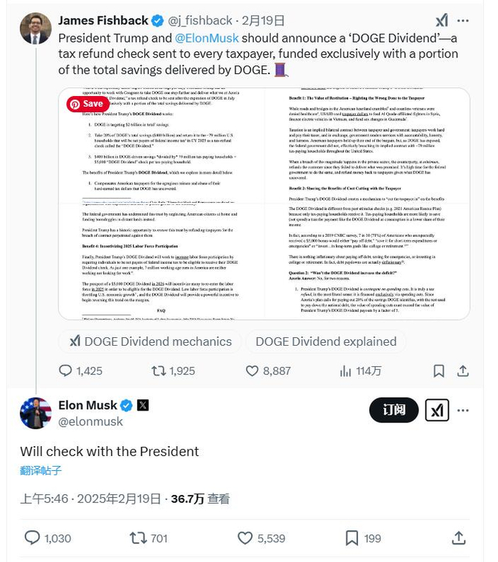 马斯克当天回应了Fishback,称他将和特朗普核实这一DOGE分红提议的可能性。马斯克回复Fishback的帖子称:“会和总统核实。”