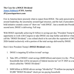 Fishback提出的分红是指,DOGE的目标是为政府省下合计2万亿美元,如果真能达到目标,这些节余中的20%、即4000亿美元可以以一种名为“DOGE分红”的退税支票形式,返还给2025年缴纳联邦政府所得税的净纳税人、约7900万美国家庭。