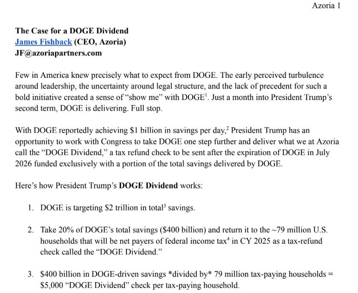 Fishback这个帖子晒出了他提出的DOGE红利相关倡议文件。文件称,特朗普应该和国会研究,在明年7月DOGE这个临时组织解散后,用DOGE的部分节省资金给纳税人派发退税支票、所谓DOGE分红。