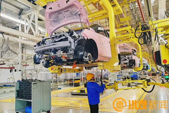 在江铃集团新能源汽车有限公司生产车间,机器轰鸣,焊接火花四溅,一辆辆新能源汽车在生产线上逐渐成型。从车架焊接、车身喷涂,到内饰装配、零部件安装,每一道工序都凝聚着科技与匠心。