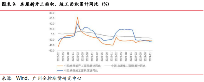 从房屋新开工、施工和竣工面积三项数据来看,指标跌幅相对较大。据Wind数据,2024年1-12月,房屋新开工面积73893万平方米,同比下降23.0%;施工面积733247万平方米,同比下降12.7%;房屋竣工面积73743万平方米,同比下降27.7%。当前地产现实面未有明显好转,前期政策利好预期落实到现实端仍需时间。最近两年在地产行业的优胜劣汰下,优质房企的资金情况和拿地意愿尚可,今年1月份房企拿地情绪出现好转,预计2025年地产新开工指标继续下行的空间有限。