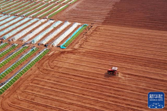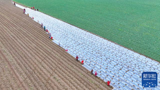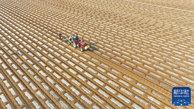 2月18日,在山东省临沂市郯城县郯城街道一处蔬菜种植基地,农民使用农机播种“订单土豆”(无人机照片)。