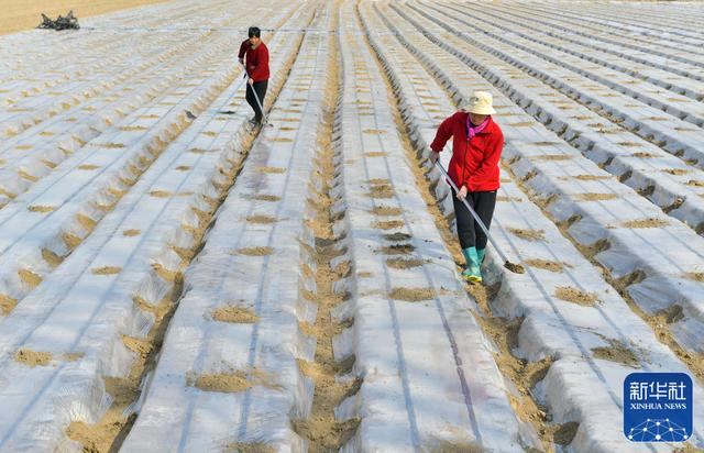 2月18日,在河南省商丘市夏邑县李集镇李中村红高粱家庭农场,村民为田间铺设的地膜覆土加固。