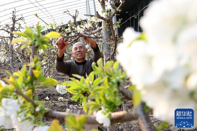2月18日,在山东省滨州市博兴县吕艺镇高渡村,农民在管护樱桃树。