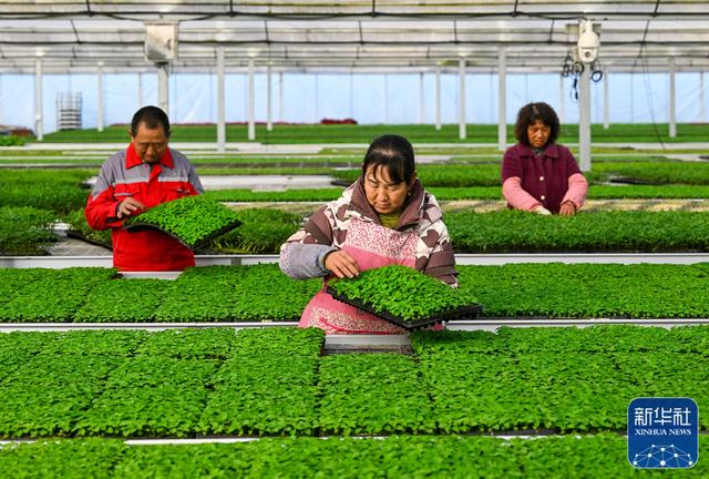 2月18日,在浙江省宁波市镇海区九龙湖镇种苗培育基地,工作人员在管护菜苗。