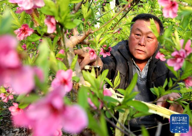 2月18日,在河北省沧州市吴桥县于集镇孙庄村,农民在给油蟠桃树剪枝。
