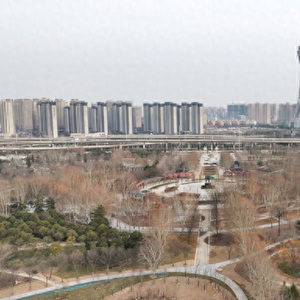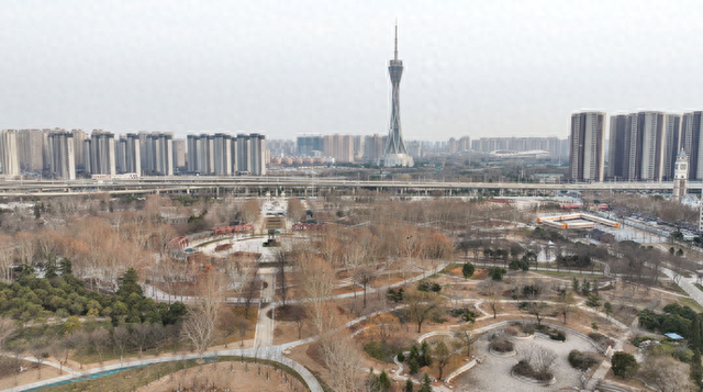 站在郑州中州大道与石化路交会处鸟瞰世纪公园,园内苗木蓄势返青,园路纵横交错,水系布局初显,游客服务中心、园艺工作室、公厕等建筑框架已成,一个全新的城市公益性公园轮廓初显。