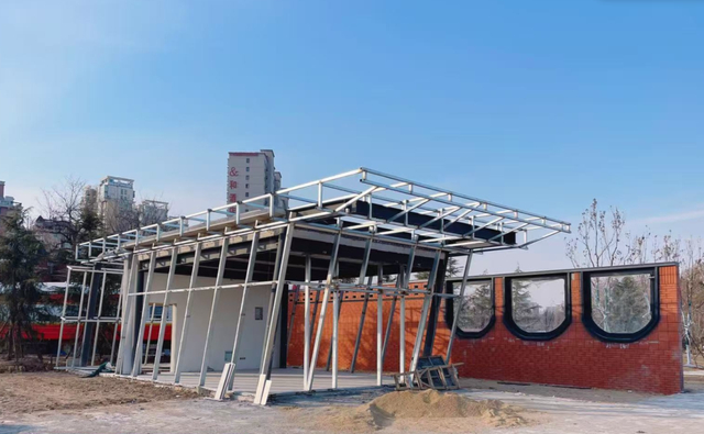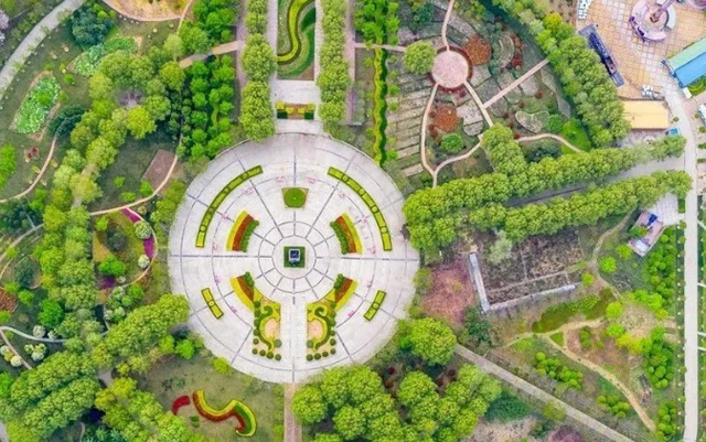 如今的公园中心位置新建了一处圆形广场,广场中心是一座鼎,公园西部的湖泊水系上的栈道框架已搭建完成,等待引入水源。一些廊架、智慧健身器材已布局好。