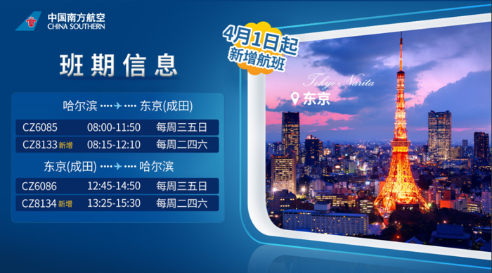 记者从南航黑龙江分公司获悉,南方航空计划自2025年4月1日起,增加哈尔滨至东京航线的班次,从每周3班往返增至每周6班往返。
