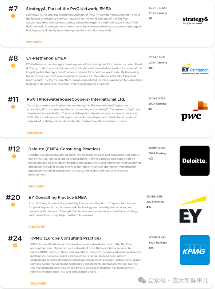 Strategy&, Part of the PwC Network, EMEA(第7名)、EY-Parthenon EMEA(第8名)、PwC (PricewaterhouseCoopers) International Ltd.(第11名)、Deloitte (EMEA Consulting Practice)(第12名)、EY Consulting Practice EMEA(第20名)、KPMG (Europe Consulting Practice)(第24名)也登上欧洲、中东和非洲地区最负盛名的咨询公司榜单!