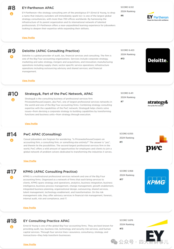 EY-Parthenon APAC(第8名)、Deloitte (APAC Consulting Practice)(第9名)、Strategy&, Part of the PwC Network, APAC(第10名)、PwC APAC (Consulting)(第14名)、KPMG (APAC Consulting Practice)(第17名)、EY Consulting Practice APAC(第18名)也上榜亚太区最负盛名的咨询公司榜单。