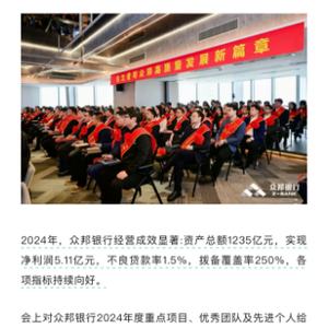 近期,机构之家从“众邦银行微讯”公众号了解到,在2025年度工作会议暨表彰大会中,也同步披露了去年业绩概况:2024年,资产总额1235亿元,实现净利润5.11亿元,不良贷款率1.5%,拨备覆盖率250%。该行自我评价为:“经营成效显著”、“各项指标持续向好”。
