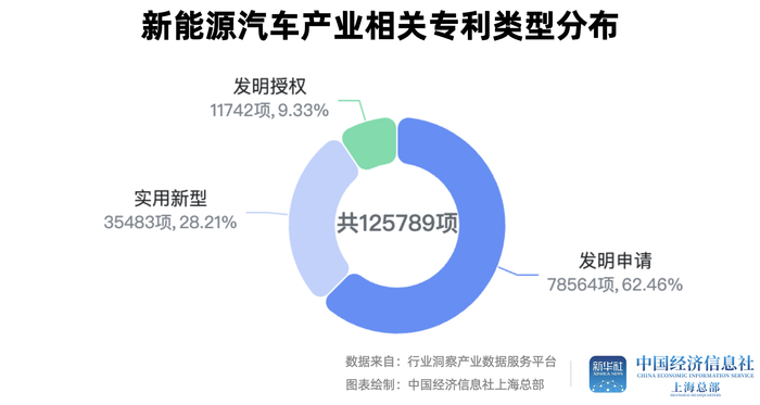 中经社行业洞察系统数据还显示,2019年以来,中国新能源汽车产业的专利申请数量呈现出增长的趋势。2024年,新能源汽车共有125789项专利,其中发明专利(含发明申请和发明授权)占71.79%,实用新型占28.21%。