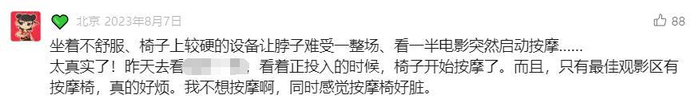 “线上买票选座位时,根本不知道自己买的座位是共享按摩椅。看电影的时候,我没有任何操作,按摩椅就突然启动了,吓了我一大跳。观影结束后,共享按摩椅的按摩球硌得我腰疼。