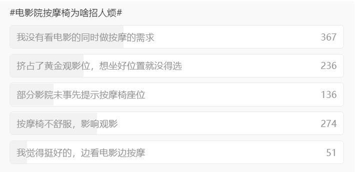 在一项“电影院按摩椅为啥招人烦”的投票中,1064名网友参与投票,只有51人认为“觉得挺好,边看电影边按摩”,其余网友均表示出不满。有网友表示,按摩回家后脊椎疼痛,甚至被按淤青。