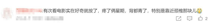 “到了影院才发现黄金观影区全部都是共享按摩椅。刚开始,按摩椅自动启动,有几分钟的试体验。但结束时,按摩球并没有归位,凸出的位置刚好顶住我的脖子,害得我全程都只能保持前倾的姿势看电影。”