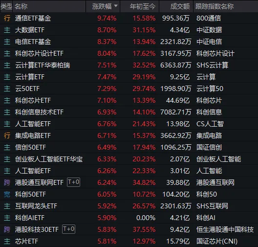 截至收盘,今天领涨的ETF都是云计算、大数据、机器人、信创等科技方向的主题型产品。