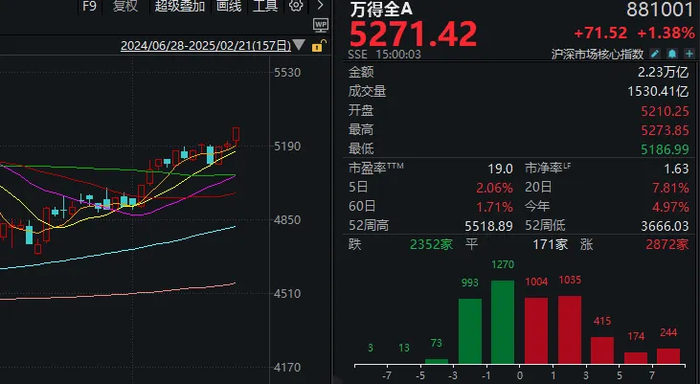 2月21日,市场全天震荡走高,创业板指领涨,科创50指数涨近6%,创2023年4月26日以来新高。截至收盘,沪指涨0.85%,深成指涨1.82%,创业板指涨2.51%。