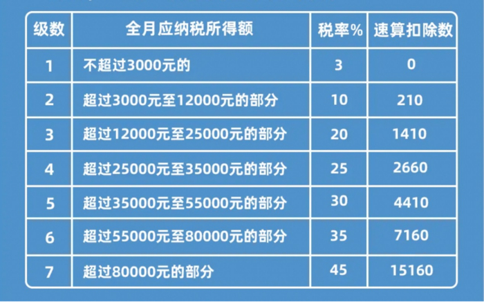 1.确定适用税率:以全年一次性奖金收入除以12个月得到的数额,按照月度税率表,确定适用税率和速算扣除数。24000÷12=2000(元),对应税率为3%,速算扣除数为0。