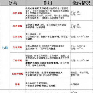 七险:养老保险、医疗保险、生育保险、失业保险、工伤保险、长期护理险、团险;