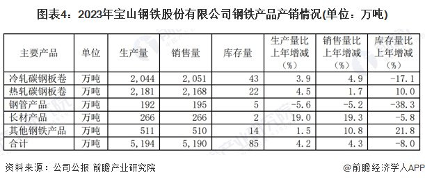 2023年,公司冷轧碳钢板卷和热轧碳钢板卷产量分别为在2044万吨和2181万吨,同比分别增长3.9%和4.5%,销售量分别为2051万吨和2168万吨,同比分别增长4.9%和1.7%;钢管产销量不足200万吨,产销分别同比下降5.6%和5.2%;长材产品产销均为266万吨,同比分别增长19%和19.3%。