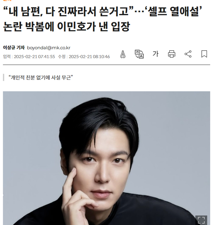 2月20日,据韩媒报道,演员李敏镐所属公司MYM娱乐正式回应称:朴春关于“李敏镐指使其上传恋爱帖”的主张“毫无事实依据”,强调两人无任何私交,彻底否认了这场持续半年的“单方面恋爱传闻”。