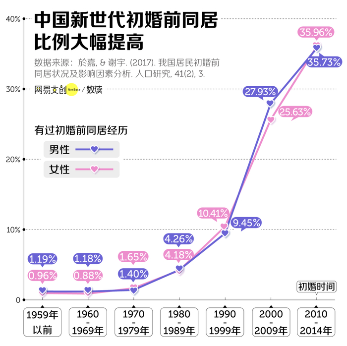 《人口研究》中的一篇论文同样表明,不同世代初婚前同居的比例明显上升。在1959年初婚的男性和女性中,初婚前同居的比例才不到2%,而在2010-2014年初婚的人群中,超过三分之一都在初婚前与伴侣同居 [4]。