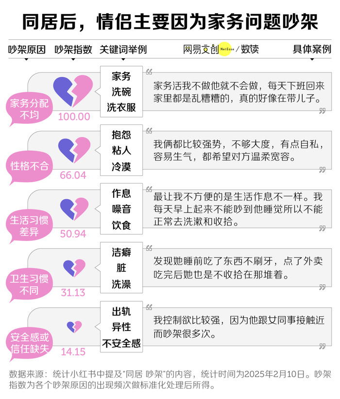 我们统计社交平台上关于同居的贴文,发现同居后伴随而来的问题可不少,第一个便是吵架。