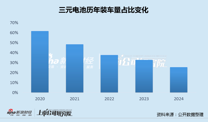 值得注意的是,尽管容百科技市占率有所提高,但受磷酸铁锂能量密度不断上升和降本的替代影响,国内三元正极材料的市场份额却逐年下降,从2020年的60%以上大幅下降至2024年的25%左右。