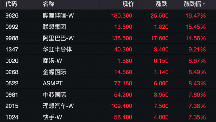 今日,科技主线在A股、港股均表现强势,港股恒生科技指数收涨6.53%。个股方面,哔哩哔哩涨超16%,联想集团涨超15%,阿里巴巴涨超14%,华虹半导体涨超9%,商汤、金蝶国际等涨超8%,中芯国际、理想汽车、快手等涨超7%,腾讯控股涨超6%。