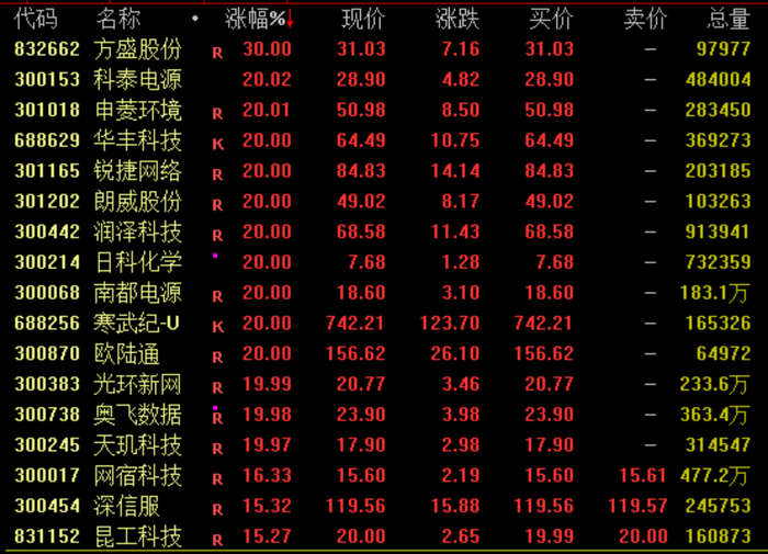 液冷服务器、算力、数据中心等AI产业链股盘中集体爆发,截至收盘,方盛股份30%涨停,科泰电源、申菱环境、锐捷网络、南都电源等20%涨停,曙光数创涨超12%。